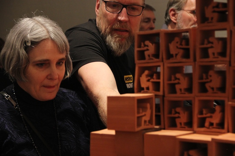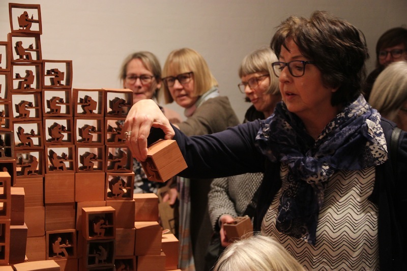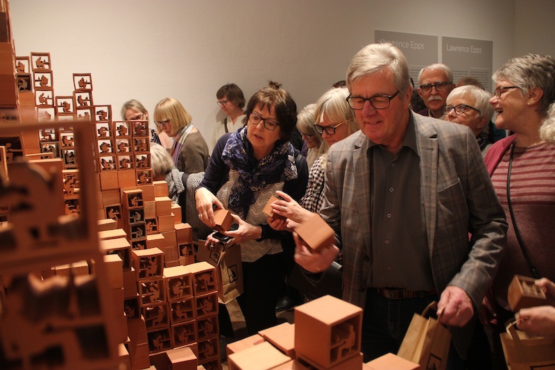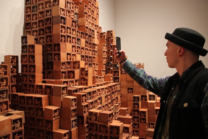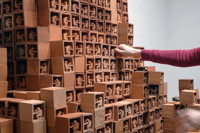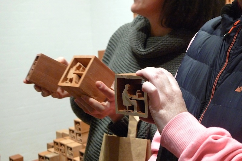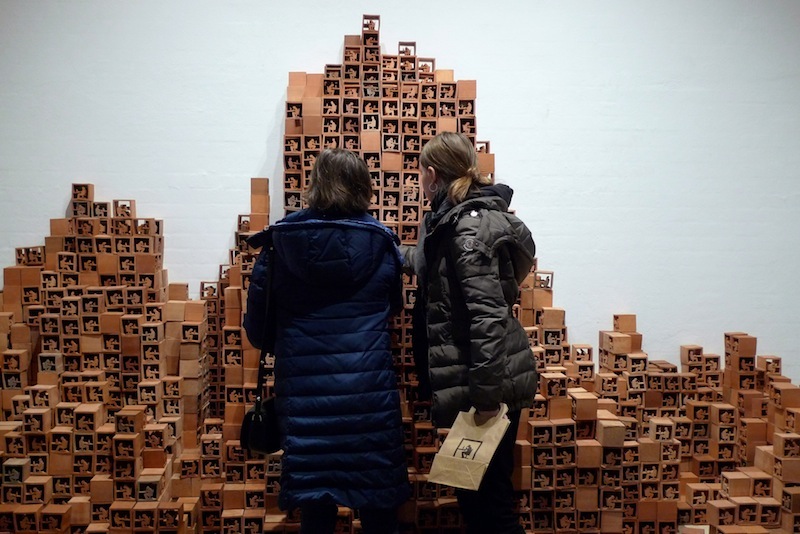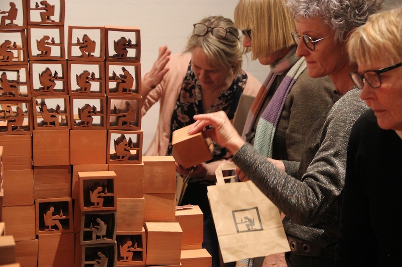 Take Stock at Museum Jorn invited visitors to take one of 4,000 units of the sculpture away with them and unbuild the sculpture. Over the course of the show, the visitors' interactions with the ever decreasing work were captured on camera. Once the last block was gone, the sculpture was replaced by a projection of these interactions played in reverse: the public was seen building the work, constructing the structure, the system, piece by piece and choice by choice. At the same time the original work ended up in the hands and homes of visitors while the museum was left only with images.